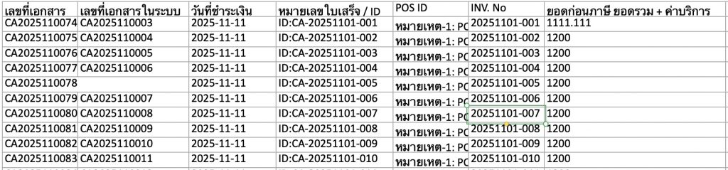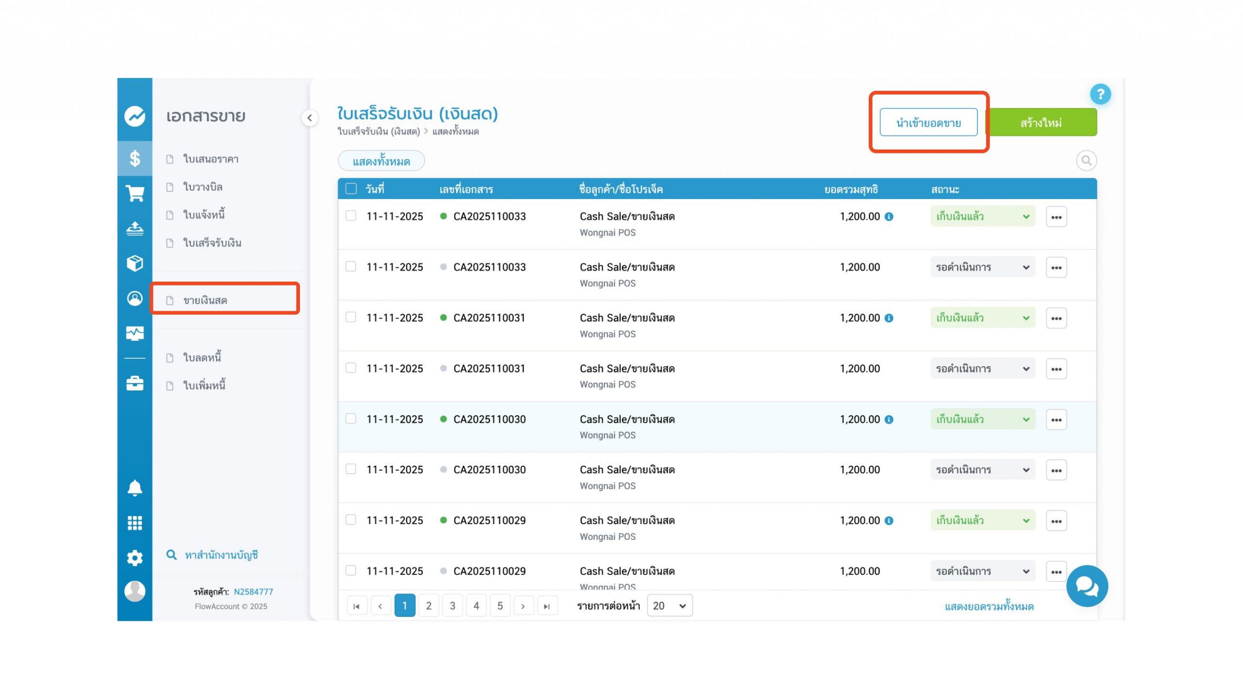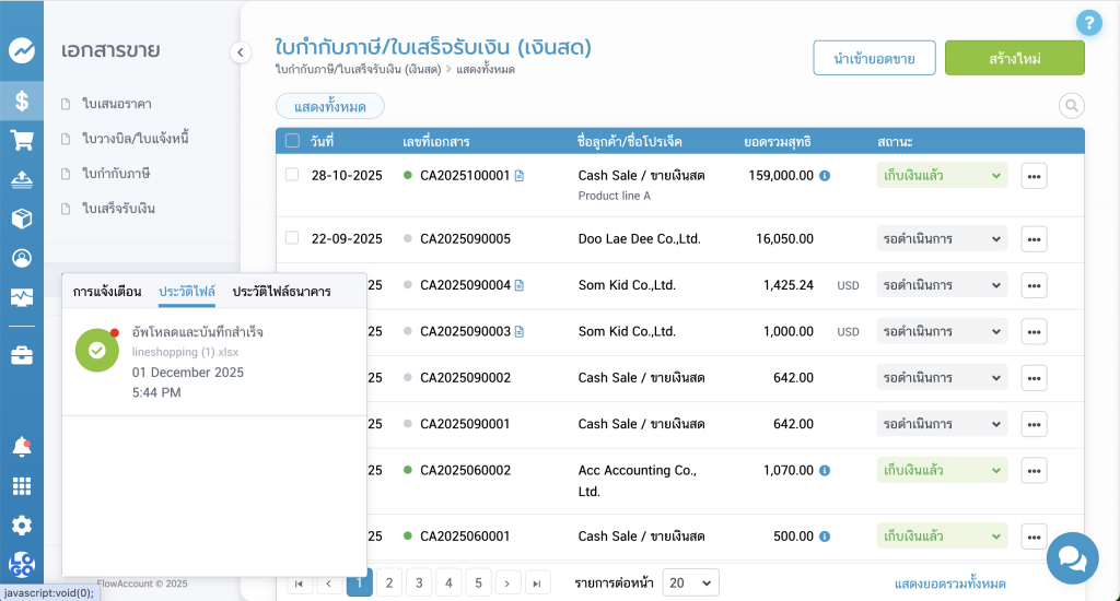 - หลังนำเข้าข้อมูลสำเร็จ ระบบจะสร้างเอกสารขายเงินสด (Cash Invoice: CA) ให้อัตโนมัติตามข้อมูลที่นำเข้าและสามารถเลือกได้เปลี่ยนสถานะเอกสารเป็นชำระเงินแล้วจากการนำเข้าได้