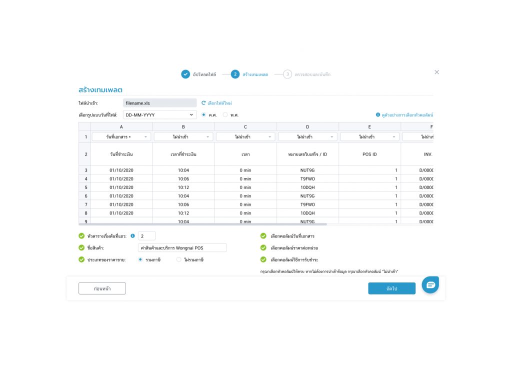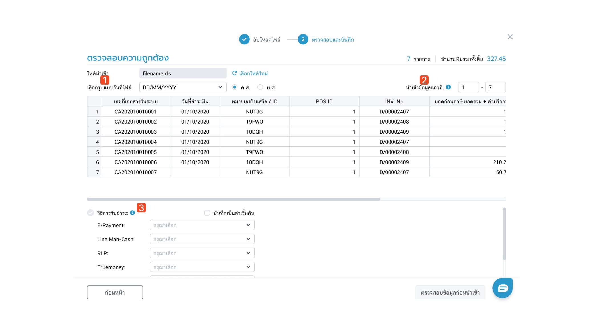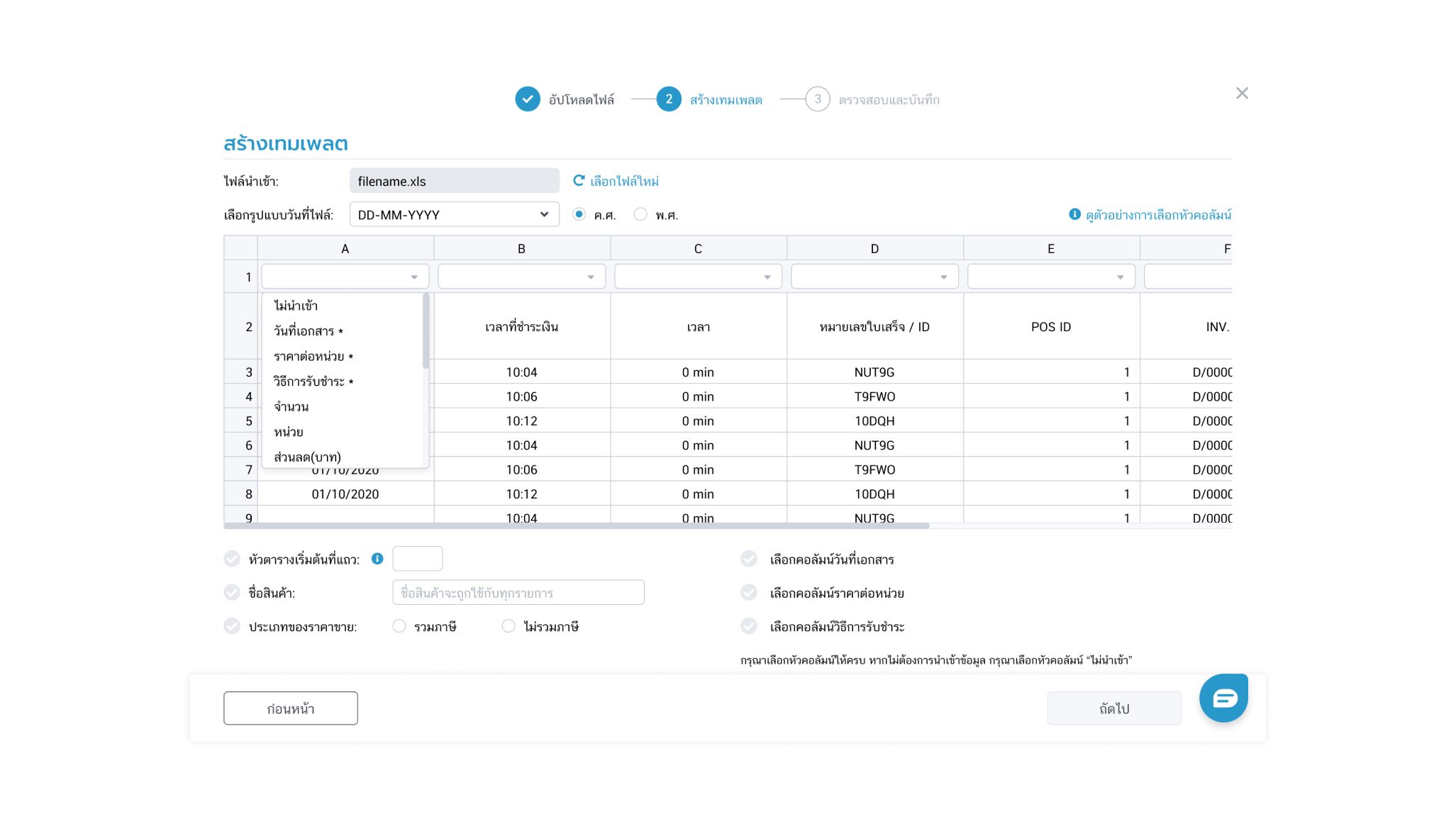 - คอลัมน์ที่ต้องการนำเข้า – *จำเป็นต้องระบุ วันที่เอกสาร, ราคาต่อหน่วย, วิธีการรับชำระ