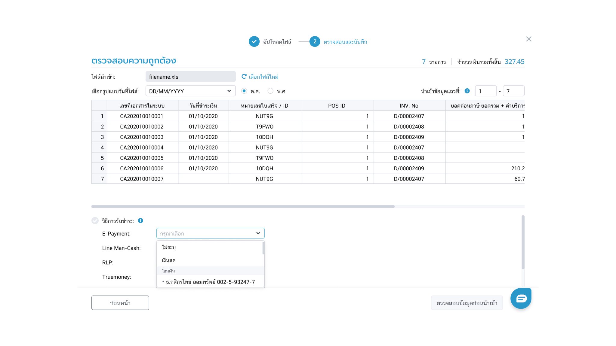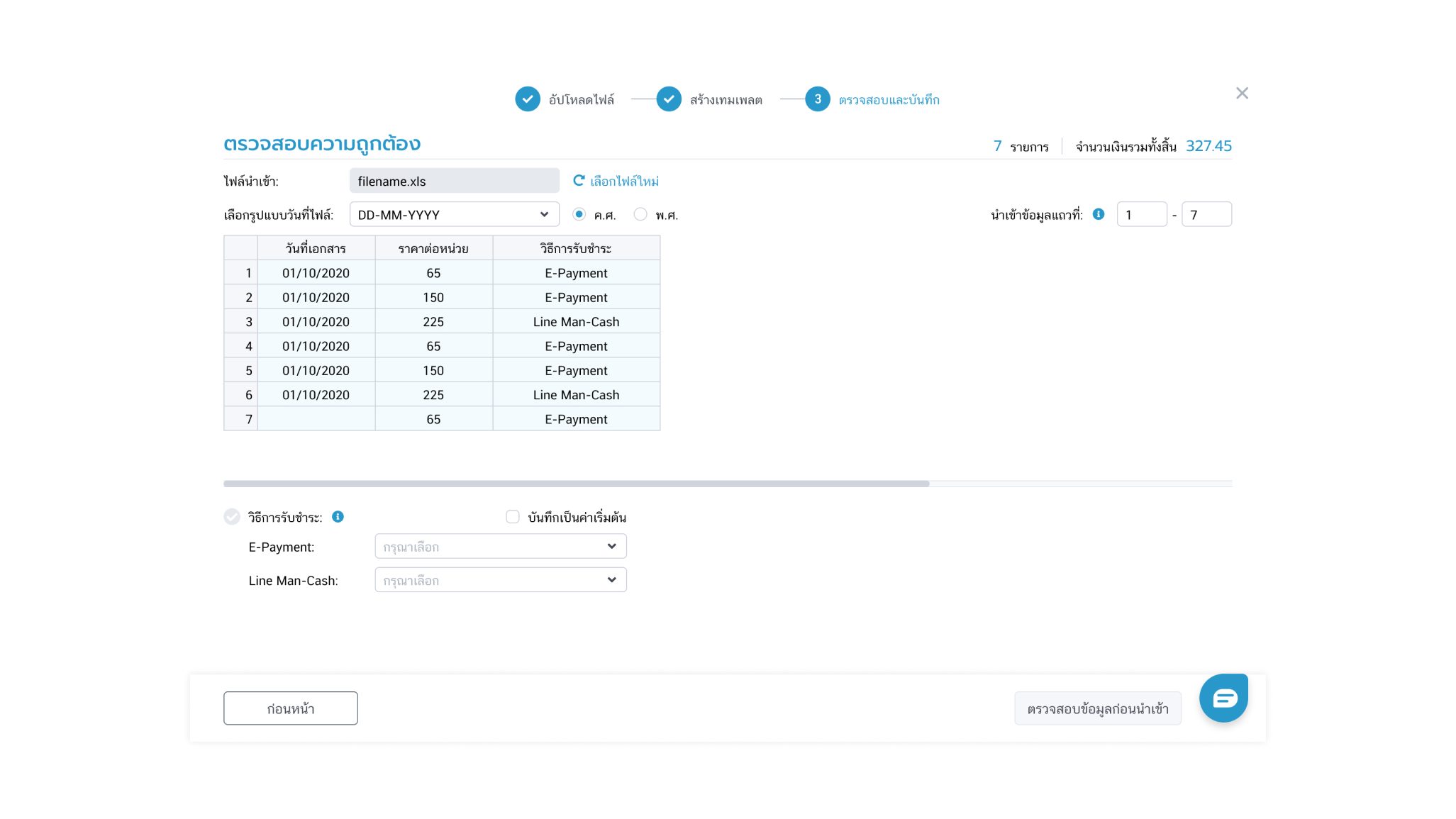 - สำหรับวิธีการรับชำระที่เว้นว่างในเทมเพลต ระบบจะสร้างเอกสารเป็นสถานะ ‘รอดำเนินการ’ หลังนำเข้าสำเร็จ