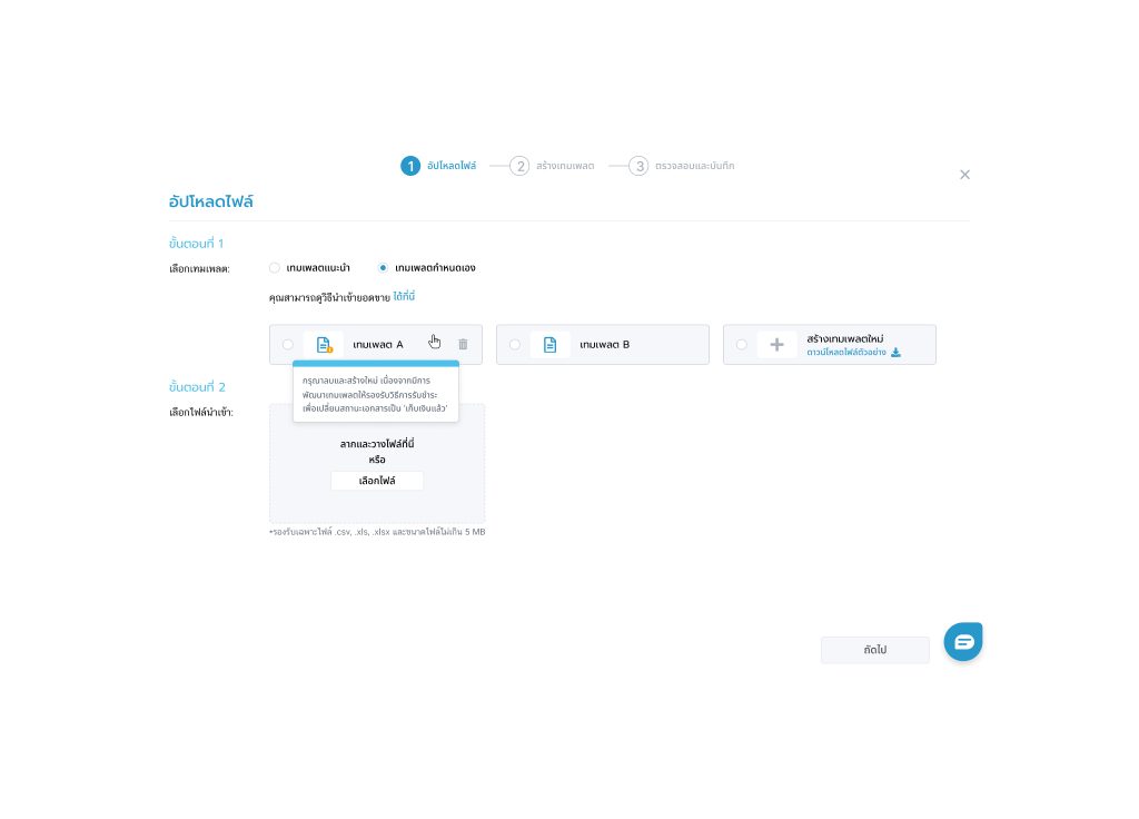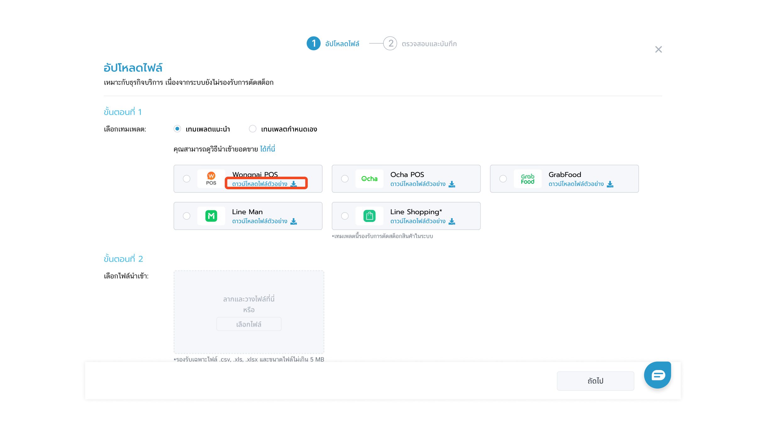 2. หลังจากเลือกประเภทของเทมเพลต กดเลือกไฟล์ของเทมเพลตที่ต้องการนำเข้า โดยหากเลือกเทมเพลตแนะนำ จะต้องเป็นเทมเพลตของแพลตฟอร์มที่เลือกเท่านั้น สามารถดาวน์โหลดดูไฟล์ตัวอย่างของแต่ละแพลตฟอร์มได้โดยคลิกที่ ‘ดาวน์โหลดไฟล์ตัวอย่าง’