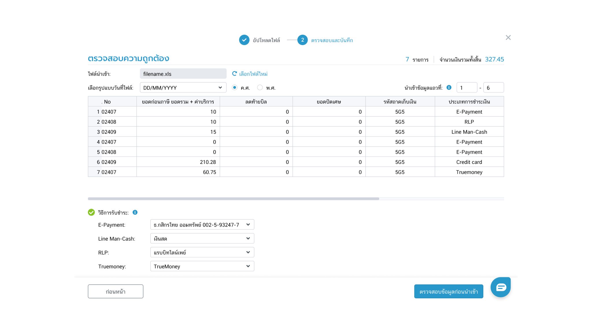 - หลังจากอัปโหลดไฟล์ ระบบจะพาไปที่หน้า ‘ตรวจสอบความถูกต้อง’ ผู้ใช้งานจะต้องระบุข้อมูล ดังนี้